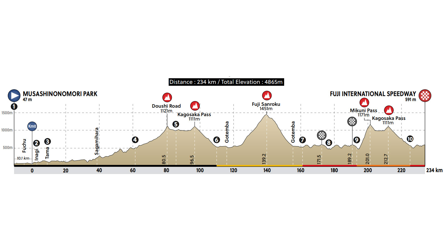 A escalada do Fuji é uma legítima categoria 'hors concours’, 14,5km a 6%. Tirando os países “pequenos”, que deverão atacar logo na largada para mostrarem as cores de seus países, Fuji deverá ser onde os ataques importantes e o xadrez tático dos países favoritos começarão.