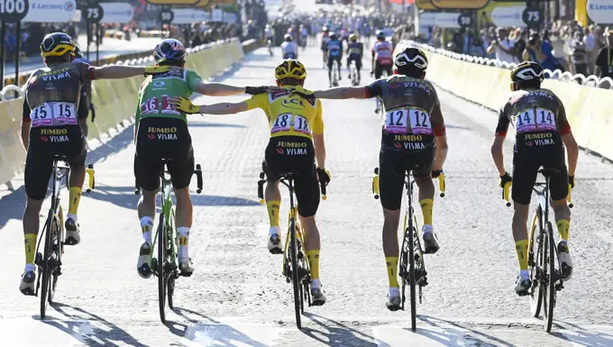 Apesar de ser provavelmente o mais completo ciclista do mundo, Van Aert escolheu estar ao lado da equipe, a Jumbo-Visma, e deixar a glória pessoal de lado. Depois de uma tentativa de fuga ao quilômetro zero - que não passou, na verdade, de uma pequena brincadeira, paradigmática do seu jeito de correr - não foi ao sprint final e cortou a meta na traseira do pelotão, abraçado aos outros quatro resistentes de uma equipe que foi fustigada por lesões, doenças, covid-19.